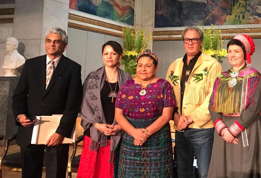 (Featured in the photo from left to right: Fred de Sam Lazaro, Special Correspondent PBS NewsHour; HolyElk Lafferty, Dakota leader at Standing Rock; Nobel Peace Prize Laureate Rigoberta Menchu-Tum; Grand Chief Edward John, Hereditary Chief of the Tl’azt’en Nation and member of the United Nations Permanent Forum on Indigenous Issues; President of the Sami Parliament Aili Keskitalo; photographed at the 2017 Nobel Peace Prize Forum Oslo.)