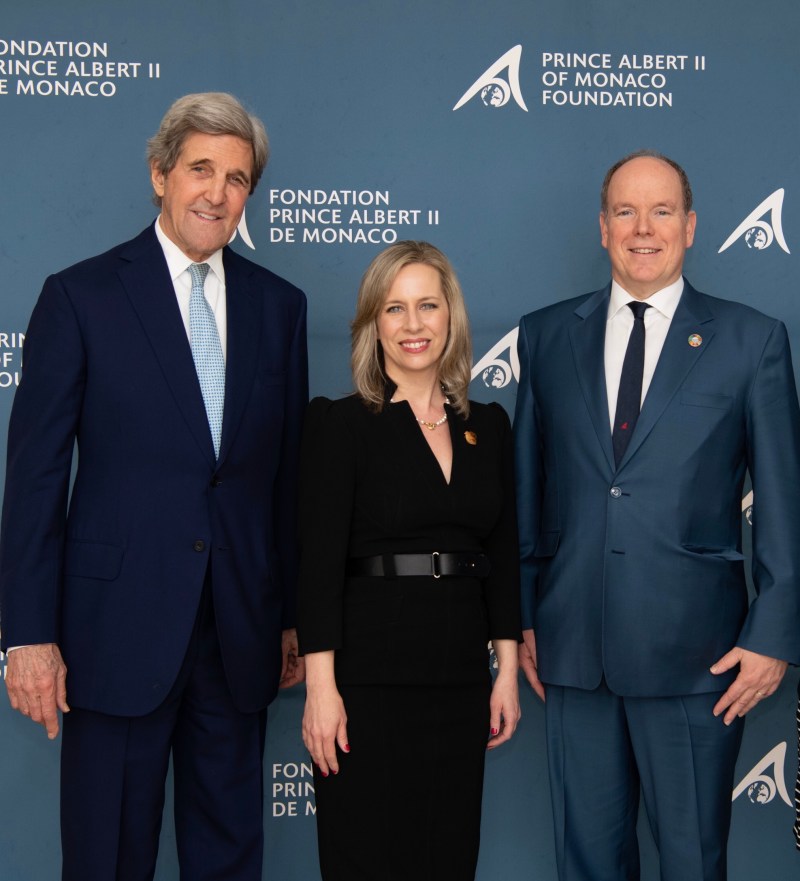 68th US Secretary of State John Kerry, with Director of the International Center for Dialogue and Peacebuilding Gina Torry, and His Serene Highness Prince Albert II of Monaco at the high-level Informal Intersessional BBNJ “High Seas Treaty” dialogue held in Monaco in March 2020.